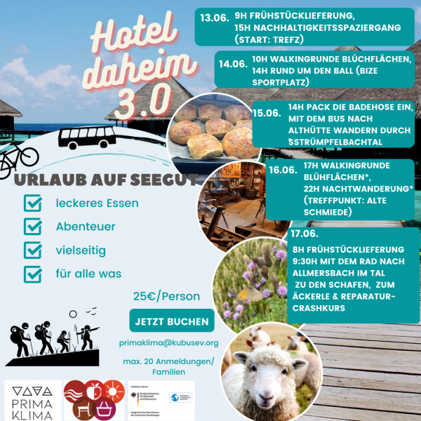 Urlaub mal zu Hause, ein verändertes Konsumverhalten – statt all-inklusiv – erleben und sich auf andere Art verwöhnen lassen. Schulgebäude oder kommunales Gebäude wird zum Ferienort. Vereine und Institutionen bieten Unterhaltung, Essen etc. an.
