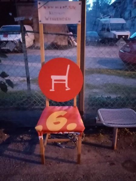Stuhl wurde Coronabedingt abgebaut, dann auch noch geklaut. Bilden von Signalgruppen um sich zum Mitfahren zu verabreden.