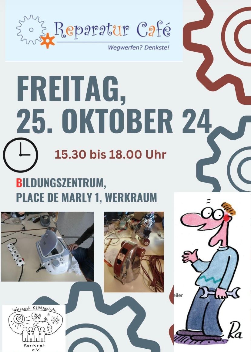 Jeden letztem Freitag im Monat findet das Reperatur-Cafe im Werkraum des Bildungszentrums Weissach statt. Hier habt ihr Gelegenheit mit Euren kaputten Geräten zwischen 16:30 und 19:00 Uhr vorbei zu kommen und unter fachlicher Anleitung alles wieder zum Laufen zu bringen oder Instand zu setzen. Das spart nicht nur bares Geld sondern auch Ressourcen, ein Gerät nicht direkt wieder neu zu produzieren sondern das bisherige weiterhin zu verwenden. Ganz nebenbei kann man so seine Fingerfertigkeiten erlernen und ausbauen und wer weiß, vielleicht gibt es beim gemeinsamen Reparieren und schrauben direkt die eine oder andere innovative Idee!